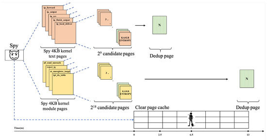 Memory deduplication attacks identify pages used in a victim VM or on a website, exploiting the memory deduplication feature and measuring the execution time of the write access to distinguish merged from normal pages. Suzaki et al. [11] detected a downloaded file from the browser of a victim VM by mounting the memory deduplication attack. Gruss et al. [24] also conducted a memory deduplication attack against the page used in a sandboxed browser, in which the sandbox is broken when a victim opens a website or checks the application program in use. Barresi et al. [25] determined the user address space layout breaking the ASLR on a victim VM, applying a similar approach as our attack. However, there are some clear differences between them. First, our target is the KASLR, and we accurately analyzed its effect on the kernel address space, where kernel symbols are relocated through a static relocation (i.e., R_X86_64_PC32 and R_X86_64_32S). Second, our study can also determine the based addresses of the kernel modules that have a longer attack time and greater space complexity. Using a divide-and-conquer approach, we effectively overcome such challenges.