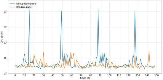 Figure 4 shows the traces of the measured latency of the write access for two different pages: one page has duplicates in memory and is therefore extremely likely to be deduplicated, whereas the other does not. As shown in Figure 4, a number of peaks occur only in duplicate pages owing to the repetition of merging and splitting through the CoW mechanism.