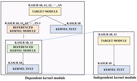 In the figure, represents the entropy of the kernel text, and represents the entropy of the kernel module, which has a reference to the kernel text, and so on. Suppose that a kernel page p belongs to the kernel module whose entropy is . As the kernel module has a reference to the kernel text, the entropy that p contains is in total. Hence, a naive approach to find out the content of the page p is to guess all the candidate pages. For certain modules like the target module in Figure 5 that has references to N other kernel modules, the guessing complexity will dramatically increase to .
