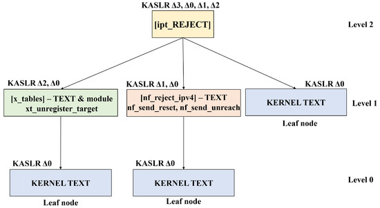 In Linux, iptables consists of multiple kernel modules. In our experiment, we focus on the ipt_REJECT module because it has the highest dependency, as shown in Figure 6. The module ipt_REJECT is responsible for handling packets that are subject to rejection according to the filtering rules. As shown in Figure 6, the module ipt_REJECT has dependencies on the kernel text as well as on the other kernel modules. To infer the base address of ipt_REJECT, the spy has two tasks; the first is to determine the base address of the kernel text and the second is to find all base addresses of the other modules referenced by ipt_REJECT.