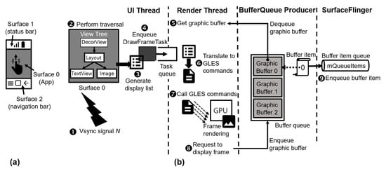 Figure 1b illustrates the frame rendering process. When user input changes views, the UI thread invalidates the views to indicate that they need to be redrawn. The rendering of these views starts with a V-Sync signal (step 1) that HWC generates every 16.7 ms, 60 times per second. The UI thread first traverses a view tree from a root view called
