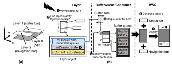 A BufferQueue consumer (BQConsumer), a component in SurfaceFlinger, acquires a grbuffer from a buffer queue and designates the grbuffer as a texture with the following procedure. It first receives a buffer item delivered from BQProducer to obtain grbuffer number n (e.g., 0) (step 4), which is used as an index into an array named mImages in BQConsumer. SurfaceFlinger implements the array in its local memory so that BQConsumer can access a grbuffer by n. An entry in the array contains the handle and state of a grbuffer, and an EGLImage that is created with the grbuffer. BQConsumer designates a grbuffer indexed by n as a texture (step 5) by assigning mImages [n] to its variable mCurrentTextureImage, which specifies a grbuffer with which to make and coordinate a texture as follows. The first step is to create an EGLImage through the grbuffer and bind the EGLImage to a texture, and the second is to coordinate the texture layout through the layout information in the mDrawingState. HWC composes the texture, the navigation bar, and status bar into one image according to their Z-order levels (step 6). Finally, the image is displayed on the screen (step 7).