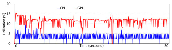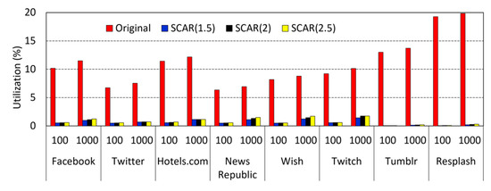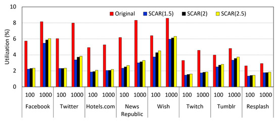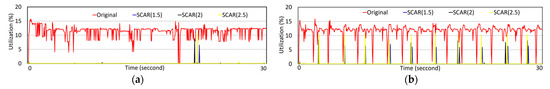 Figure 10a, the GPU utilization for the speed of 100 pixels/s remains at about 12% in “Original” due to consecutive rendering operations, whereas it remains level at about 0% in SCAR for the time intervals when an exFrame is reused, but rises up to 7%, 9%, and 11% in SCAR(1.5), SCAR(2), and SCAR(2.5), respectively, when an exFrame is rendered due to scrolling overflow. A larger exFrame size causes a slight increase in the GPU utilization due to the increase in the quantity of content to be rendered, but makes little impact on average GPU utilization due to extremely low frame rates, as shown in
