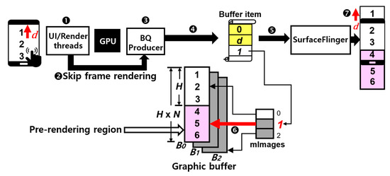 There are some issues in implementing SCAR into the Android graphics pipeline due to the following architecture characteristics. First, an app consists of the UI thread in the Java layer and the render thread in the native layer. This separation of the two layers causes an issue in delivering a scrolling distance and the scrollability of a window from the UI thread to the render thread. Second, the three components, app, BQProducer, and SurfaceFlinger, run in separate processes. The non-open-source GLES library also interferes in the flow control where the render thread enqueues a grbuffer with a rendered frame into a buffer queue. These characteristics made it difficult for us to deliver the scrollability and a scrolling distance from the UI thread to the render thread, and a total scrolling distance d and the rendering indicator from the render thread to BQProducer.