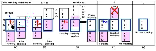 12] that was introduced in the early 1990s to reduce redrawing operations upon scrolling in video games in desktop PCs. When rendering a frame for content to be displayed on screen, SCAR pre-renders content that is likely to be displayed soon in a subsequent scrolling action. This frame is then extended to place the pre-rendered content contiguously with the content to be displayed. In any subsequent scrolling, SCAR repositions the extended frame on the screen by a scrolling distance, without needing to render a new frame. This reposition can significantly reduce frame rates resulting from scrolling. Moreover, our scheme has an important feature to be applicable to various display panels regardless of the type of display technology because it attempts to lessen frame rates to reduce CPU and GPU overheads caused by frame rendering operations.