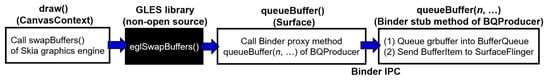 d, from the render thread executing Algorithm 1. However, there were two challenges in transferring the two parameters to the stub method via the Skia method swapBuffers() that triggers sending a buffer item to SurfaceFlinger. First, we cannot modify the source code of the eglSwapBuffers() to pass the parameters to its callee method queueBuffer() of the Surface because it is implemented in the GLES library. Second, a new Binder IPC channel should be created for transferring the parameters from the queueBuffer() to a process executing BQProducer. However, this creation requires a complete understanding of the Binder IPC and an Android rooting that can cause a system integrity problem.