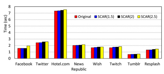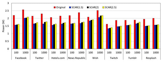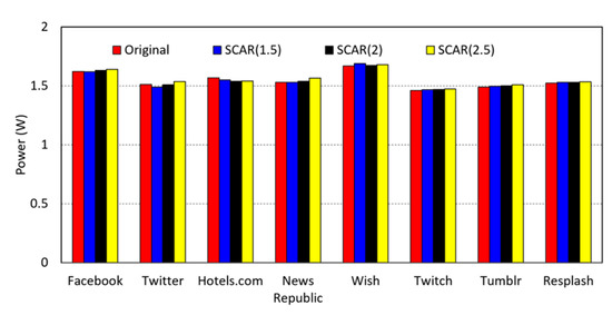 Figure 8 presenting the result in the experimental setting that turned off Bluetooth, GPS and minimized the display brightness. This is because the display panel, Bluetooth, and GPS persistently consume a specific amount of power upon scrolling, thus offsetting the power consumption improved by SCAR(1.5). As the result, we confirm that SCAR has the advantage of saving the power even in a realistic operating scenario that uses a higher display brightness and turns on Bluetooth and GPS, compared to “Original”.