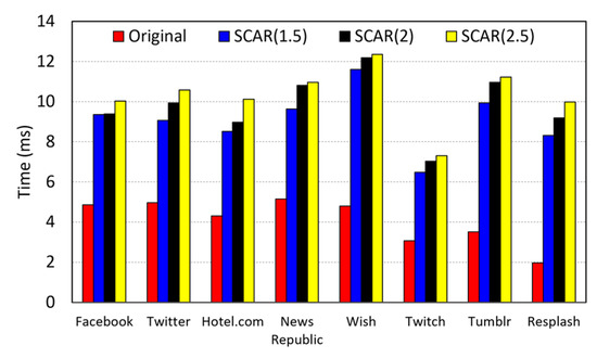 Figure 13. The extremely low frame rates in SCAR indicate that the reusing operations of exFrames are dominant over the rendering operations executed by the Skia rendering operation with a large CPU overhead. This leads to the decrease of 67% to 86% in the execution time over “Original”, because the Skia rendering operation is not executed in reusing an exFrame. This reduction surpasses the increase in the execution time of the performTraversals() in