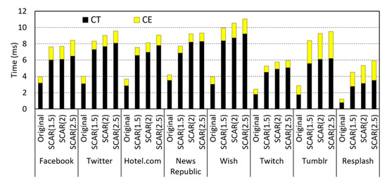Figure 14, we observe that the Skia rendering operation spends more than 80% of the execution time of the draw() in all the apps. SCAR(1.5) increases the CT time by 89% to 252% compared to “Original”. There is an increase in display lists because extending a frame causes more views to be redrawn. This increase makes the CPU translate more drawing commands to GLES commands. We observe an increase of 12% to 294% in the CE time in SCAR(1.5). As more GLES commands are generated, the CPU executes more GLES commands to render a larger frame, thus increasing the CPU overhead. The comparison of the CT and CE times indicates that the CT time accounts for a large portion of the overall execution of the Skia rendering operation, thus having a large impact on the CPU overhead. Moreover, it is notable that an app with fewer views can have a larger execution time of the Skia rendering operation than other apps. This results from the view features that have an impact on the number of drawing commands for a view.