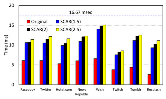 Figure 16 presents the total rendering time that is the sum of the two execution times of the performTraversals() and draw() for the speed of 100 pixels/s. The total rendering time is less than 16.7 ms in all the apps but increases in proportion to the exFrame size. As a result, SCAR(1.5) is the most appropriate, because it can not only avoid the screen tearing problem, but also save power, comparable to SCAR(2) and SCAR(2.5).