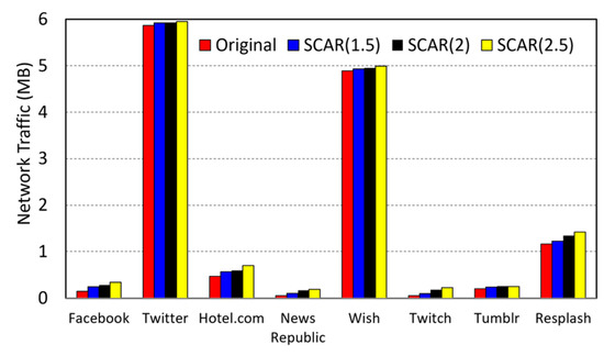 Figure 17 shows the network traffic in launching a scrollable window. SCAR(1.5) increases the network traffic by up to one fold, compared to “Original” respectively. There is also an increase in the network traffic in proportion to the exFrame size because a larger frame size causes an app to fetch more content from its remote server for the pre-rendering. Fortunately, SCAR slightly increases the network traffic on Twitter, Wish, and Resplash generating large network traffic. For example, SCAR(1.5) with the best power savings leads to an increase of 1% to 5% in the network traffic on these three apps. On the other hand, the other apps with small network traffic suffer from an increase of 16% to 83% in the network traffic, but the increased amount of network traffic is very small. These results confirm that extending a frame does not cause large network traffic in launching a scrolling window.