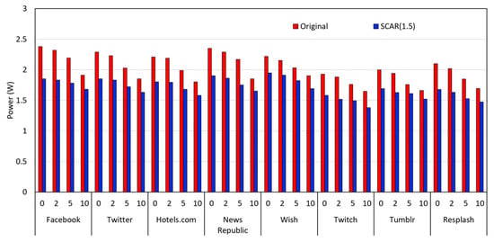 As the reading interval time increases, there is a decrease in the power consumption in “Original” and SCAR(1.5) because the reading time interval reduces frame rates by lowering a frequency of scrolling operations. This decrease in the frame rates gives SCAR(1.5) less opportunity to improve the power consumption because SCAR(1.5) has a large advantage on scrolling operations causing high frame rates. Fortunately, SCAR(1.5) improves the power consumption by 9% to 21% and by 8% to 18% at the reading time intervals of 2 and 5 s respectively, compared to “Original”. Moreover, there is the improvement of 7% to 15% even at the large reading time interval of 10 s. This result confirms that our scheme can improve the power consumption in the realistic smartphone usage scenario even if frame rates become lower due to the reading time interval.