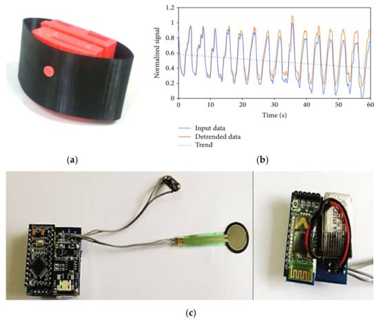 Prototype of the device discussed in [] (a) and schematic representation of the piezoresistive sensor (b). Output signal includes both pulse wave and respiration component (left) and after being filtered by a 100 Hz high-pass for extracting the breathing component (right) (c).