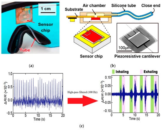 Furthermore, in [], T.V. Nguyen and M. Ichiki developed an easy-to-mount and comfortable device to simultaneously measure heart rate and RR using a single sensing element, taking advantage of the piezoresistive behaviour. The microelectromechanical system (MEMS)-based pressure sensor was mounted on a pair of eyeglasses, causing minor complaints to the wearer (critical for sports usage) (Figure 2a). The heartbeat and breathing cause a change in the tube’s inner pressure due to the skin vibrations attached to the eyeglasses’ nose pad. To measure these pressure changes, they used a solution preventing the piezoresistive cantilever from breaking (it has been tested for four months). The cantilever was placed in an air chamber connected with a silicon tube, making the sensor sensible to the internal pressure changes (Figure 2b); a Wheatstone bridge circuit was used to evaluate the resistance changes.