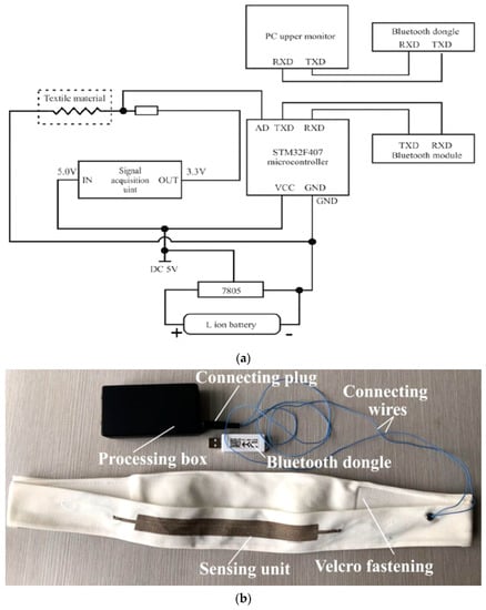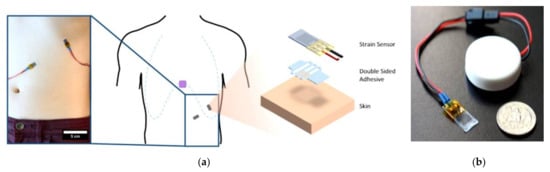 Strain sensors placed on the ribcage and abdomen (a); developed sensing unit equipped with a strain sensor (b) [].