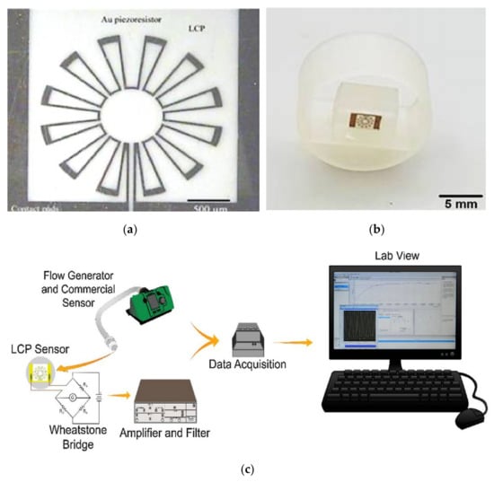 Furthermore, LCP has high chemical stability and low moisture absorption capability, making the sensor suitable for harsh environments. LCP silicon wafer bonding, deep reactive-ion etching (DRIE) for through-hole forming, sputtering a metal resistor, and lift-off for resistor patterning were the four main steps for the sensor fabrication []. The piezoresistive LCP flow sensor was a micro diaphragm unit with a 25 µm thick circular sensing membrane with a 2000 µm diameter. On the LCP membrane’s periphery, where the maximum stress is produced, 100 nm thick gold strain gauges with a serpentine shape were deposited. A circular housing to handle the tube was 3D printed, placing the sensor at the end of the flow generator’s pipe (Figure 4b). The LCP sensor was connected to an external Wheatstone bridge, followed by a 50 gain amplifier and a 3 Hz low pass filter (Figure 4c). The experimental results demonstrated that the LCP flow sensor was suitable for detecting human respiration since it has a low minimum detectable flow (i.e., 8 LPM), lower than the industrial flow sensor (>10 LPM), high sensitivity, and resolution. Also, the LCP flow sensor is featured by a good response over a broad flow range (8 ÷ 160 LPM) and a linear voltage response with 0.004 V/LPM sensitivity.
