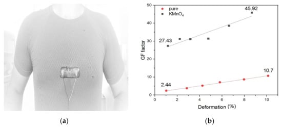 Gauge factor for MWCNTs (pure) and oxidized MWCNTs (KMnO4) sensors as deformation increases (a); sensor with PU/oxidized MWCNTs applied to a commercial T-shirt (b) [].