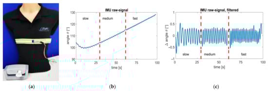 IMU-belt proposed in [] with the reference spirometer (a); IMU-signal raw (b), and filtered (c) data.