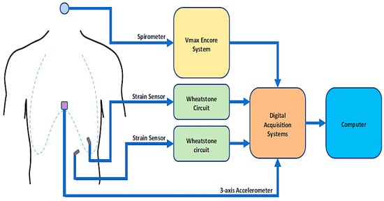 As previously discussed, M. Chu et al. presented a wearable disposable device to measure the breathing rate and volume from a strain sensor, detecting the deformation of the ribcage and abdomen during the breathing []. The ADXL326 accelerometer was positioned under the sternum with the x-axis pointing to the right, the y-axis towards the abdomen, and the z-axis towards the torso. A 20 Hz low-pass filter was applied to the resistance data derived from the strain sensors, and a MATLAB script eliminated those unsuitable resistance values due to significant amplitude changes. The dominant frequency derived from the accelerometer signal spectrum was used to determine the filter’s cut-off frequency applied to the data acquired during the subject’s movement, such as walking. At this point, the changes in resistance of the strain sensors for each breath were taken to determine peaks and breath volume values. The data obtained were compared with those derived from a spirometer to assess the subject’s breathing airflow. Figure 10 shows the general scheme of the hardware configuration used for the tests. Although the accelerometer was essential in eliminating motion artefacts due to walking, some movements cannot be eliminated, such as twisting, for which the study suggests the use of a gyroscope.