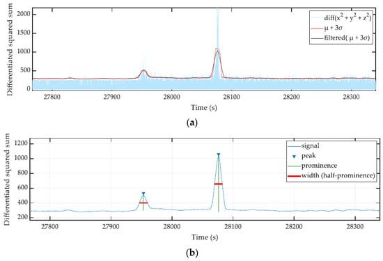 In [], the authors presented a wearable device to continuously monitor RR in patients with Duchenne Muscular Dystrophy (DMD) and Limb-Girdle Muscular Dystrophy type R (LGMD2). The device was equipped with three IMUs, viz a three-axis accelerometer, gyroscope, and magnetometer. Two IMUs were located on the chest and abdomen to measure changes in orientation due to respiratory motion; the third IMU was installed in a place unaffected by respiratory activity (such as on the bed for bedridden patients) to serve as a reference. After removing non-respiratory movements, quarters derived from the thoracic and abdominal IMUs were calculated; then, the algorithm calculated their PSD (Power Spectrum Distrition) using Welch’s method and searched for peak frequency, representing the respiration component. Afterwards, the signal was damped with a third-order Savitzky-Golay filter to calculate the duration of exhalations and inspirations. In doing so, the expiratory time, inspiratory time, and total time (TTOT) could be calculated to compute the respiratory rate as 60/TTOT.