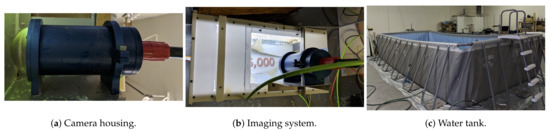 Lighting requirements and camera and lens selections are essential to building an underwater imaging system to capture images that highlight problems that are faced in various types of water. The submersible MV 30-25 camera and lens housing from Sexton [11] were selected in combination with a BlackFly-S GigE camera from Point Grey [12]. The Fujinon FE185C057HA lens has a focal length of 1.8 mm, referred to as a “fish-eye” lens, and a minimum object distance of 4 inches. The assembled camera and lens housing is shown in Figure 1a. A custom light chamber was designed and manufactured, using aluminum and a grid of high-power LEDs potted in epoxy resin. The completed imaging system used for capturing fish images and test images in water with varying levels of turbidity is shown in Figure 1b. Figure 1c shows a large water tank used for testing the prototype underwater imaging system.