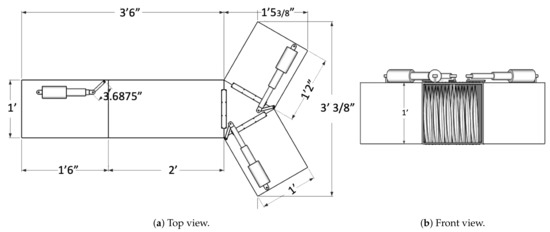 The design and dimensions of our fish separation mechanism are shown in Figure 4. It consists of 4 chambers: the inlet gated chamber (left section), the illuminated imaging chamber (middle section), the invasive species outlet gated chamber (top right section), and the non-invasive species outlet gated chamber (bottom right section). Figure 5a shows the finishing prototype of the four-chamber mechanism. Figure 5b shows the inlet and one of the two outlet gates.