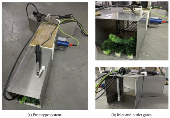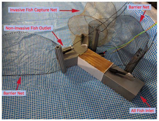 The system uses an Arduino to communicate with the vision system and control the three high current relays for the marine actuators to open and close the inlet and outlet gates. Since this application does not require high frame rates nor real-time processing, any basic computer is sufficient. An industrial NUC PC was used for this system. The fish separation mechanism was installed in a large water tank for experiments as shown in Figure 6. Two barrier nets were installed to guide the fish to enter the inlet gate and pass through the imaging chamber. An invasive fish capture net was attached to the invasive fish outlet gate to capture the invasive fish.