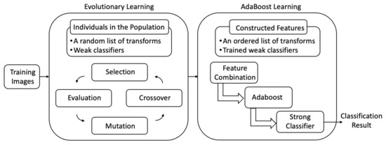 AdaBoost is used to combine the weak classifiers that are associated with the image transformations to form a strong classifier. The training process of AdaBoost classifier involves the training examples reweighting within each iteration. AdaBoost iteratively builds an ensemble of binary classifiers and adjusts the weights of each training example based on the performance of the weak classifiers in the current iteration. Examples that are misclassified will have their weights increased, while those that are correctly classified will have their weights decreased. Therefore, in subsequent iterations, the resulting strong classifier is more likely to correctly classify examples that are misclassified in the current iteration.