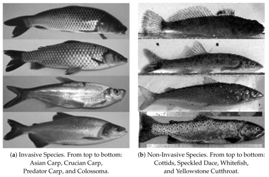 Because of the scarcity of fish in rivers or lakes, it is time-consuming to use our underwater imaging system to collect sufficient image samples of a variety of fish species for experiments. We decided to use the BYU Fish dataset [31] to validate the performance of our fish species recognition algorithm. Figure 8 shows sample images of these species. This dataset was created specifically for invasive carp recognition and for our fish species recognition algorithm, which does not require a large dataset for training. It includes four invasive species (90 Asian Carp, 110 Crucian Carp, 74 Predatory Carp, and 89 Colossoma images) shown in Figure 8a and four non-invasive species (120 Cottids, 137 Speckled Dace, 172 Whitefish, and 240 Yellowstone Cutthroat images) shown in Figure 8b. All fish images were oriented the same way. All images were sized to 161 pixels wide and 46 pixels high. They include shape and fin position variations, caused by the fish movement.