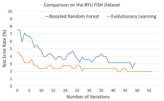 Performance comparison on the BYU Fish dataset between the boosted random forest method and the evolutionary learning method with respect to different numbers of training iterations.