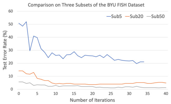 We also trained our models on three randomly created subsets of the fish training data, with 5, 20 and 50 training images per class. Figure 10 shows the performance on these three subsets, using the same model. It shows that our method obtained impressive results, even when using only 20 images per class for training and no data augmentation was used for training. It required only approximately 10 training iterations to reach its steady performance.