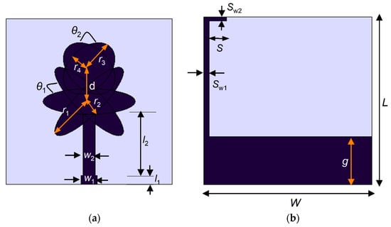 The schematic of the proposed unit cell antenna is shown in Figure 1. The antenna was designed on a Rogers RO3003 substrate with a relative permittivity (εr) of 3, a height of 0.76 mm, and a loss tangent (tan δ) of 0.001. The radiating element was a combination of elliptical structures on the front of the dielectric substrate, and a modified ground plane on the back. A 50 Ω microstrip line was used to feed the antenna. The dimensions of the antenna are: L = 22 mm, W = 22 mm, g = 6.3 mm, Sw1 = 0.7 mm, Sw2 = 0.5 mm, r1 = 6.2 mm, r2 = 1.7 mm, r3 = 4 mm, r4 = 2.7 mm, θ1 = θ2 = 45°, w1 = 2.16 mm, w2 = 1.66 mm, l1 = 1.2 mm, l2 = 8.05 mm, S = 2.3 mm, and d = 2.2 mm.