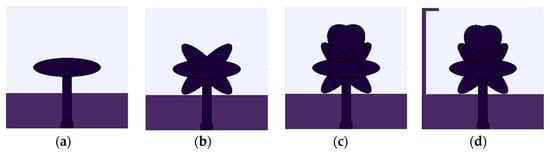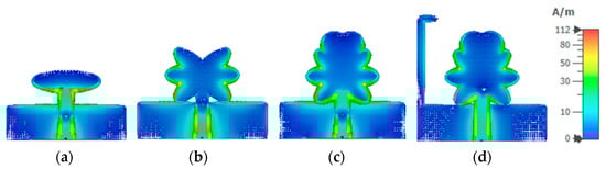 The surface current distribution of the proposed UWB antenna at various stages is shown in Figure 3. The integration of elliptical elements produces inductive loading, which increases the Q factor, as illustrated in Equation (1).