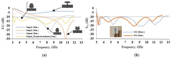 (a) simulated S11 characteristics during evolution stages (b) simulated and measured S11 characteristics of the proposed antenna element.