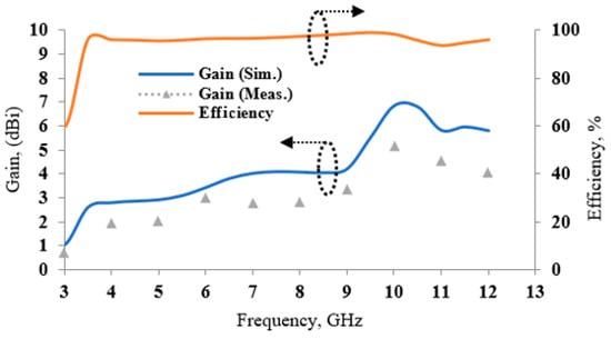 The fabricated prototype UWB antenna was measured using an Anritsu MS2037C vector network analyzer. The antenna has simulated and measured bandwidths of 8.7 GHz (3–11.7 GHz), and 9.1 GHz (3.14–12.24 GHz), respectively, as shown in Figure 4b. Figure 5 shows a measured peak gain of 5.1 dBi, and an efficiency of more than 81%.