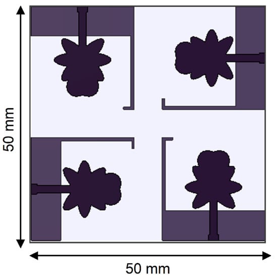 In the modern automotive industry, the UWB MIMO/diversity technique is used to improve link reliability, lower high data rates, and to overcome the effect of multipath fading. The diversity technique improves the strength of vehicle-to-infrastructure (V2I) communications. The MIMO/diversity array configuration is constructed by placing four unit cells orthogonal to each other, with an inter-element spacing of 6 mm, and dimensions of 50 mm × 50 mm to ensure good signal reception in a multipath environment, as shown in Figure 6. The radiation pattern characteristics of the prototype UWB MIMO antenna were measured in an anechoic chamber.