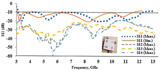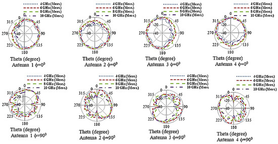 Figure 7 shows the S-parameter characteristics of the MIMO antenna. The impedance bandwidth of the antenna is 3.14–12.24 GHz, and the isolation is more than 20 dB between the ports over the operating bandwidth. The S-parameters at port-1 are only shown because of the symmetric structure of the four-element MIMO antenna. Figure 8 depicts the radiation patterns of the proposed quad-element MIMO antenna at four different frequencies (4, 6, 8, and 10 GHz) in the x-z (H-plane) and y-z (E-plane) planes. The proposed antenna exhibits an omnidirectional radiation pattern. The measured results offer good coverage for UWB communications.