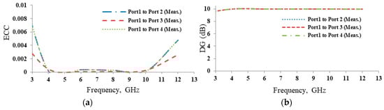 The ECC shows the correlation between the unit antenna elements. An ECC of <0.5 is an acceptable limit to be considered [14]. The ECC of the proposed antenna was evaluated using the far-field equation (2). The ECC in the UWB operating range is less than 0.004, as shown in Figure 9a. Another important parameter for determining the diversity effectiveness is the DG, which is calculated using Equation (3). Figure 9b shows that the DG over the UWB range is greater than 9.67 dB.