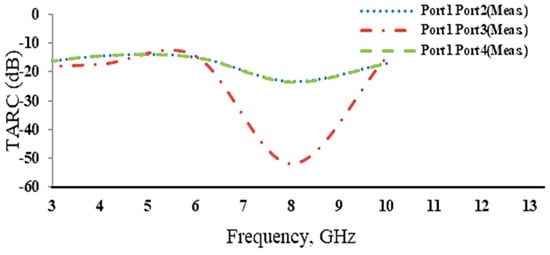 Measured total active reflection coefficient (TARC) of the proposed MIMO antenna.
