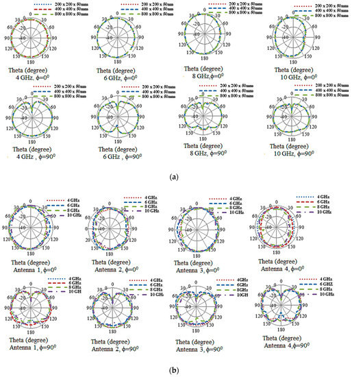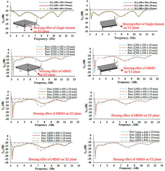 Figure 11 depicts the effects of housing on the bandwidth characteristics of the single element and MIMO antennas of different dimensions. The large metal plate has a negligible effect on the bandwidth of the proposed antenna element and the MIMO antenna in both the x-z and the y-z planes. The radiation pattern characteristics of the proposed antenna were analyzed for both single element and MIMO, where antennas placed directly on a metal plate may affect the omnidirectional radiation patterns in the x-z plane. Therefore, the aforementioned conditions must be fulfilled in order to avoid diffraction effects on the antenna’s radiation property [33]. Figure 12 depicts the radiation patterns of the single element and the MIMO antennas on different metal plates in the x-z and y-z planes. As the large metal plate acts as a reflector, the directivity of the antenna is increased by ~5 dB for a single element, and by ~2 dB for a MIMO antenna. The variation in diversity is caused by the greater height between the metal plate and the MIMO antenna in comparison to the unit antenna element.