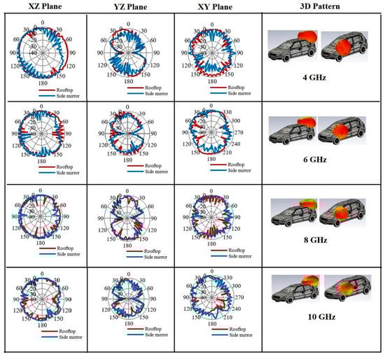 It was necessary to investigate the radiation performance of the proposed antenna when integrated at various vehicle locations. A CAD model of the car was chosen to simulate the proposed antenna in an ideal environment (free space) using CST Microwave Studio®. The surfaces of the car were modelled as PECs. The radiation characteristics of the antenna were investigated at two different locations on the vehicle. The rooftop and side mirrors were chosen for the antenna placement. Figure 13 depicts an acceptable variation of the proposed antenna radiation patterns on the car body at frequencies of 4, 6, 8, and 10 GHz (in the x-z plane, y-z plane, and x-y plane). Due to the large PEC surface of the vehicular body, which emits radiation in all directions, the antenna mounted on the rooftop exhibited an omnidirectional radiation pattern with deep nulls at 6, 8, and 10 GHz frequencies, while the antenna element implanted on the car side mirror showed an omnidirectional pattern with little distortion, and a maximum radiation ranging between 30° and 90°. Thus, it is clear that the side mirror is the best location for mounting the proposed antenna. It is understood that small back radiation appears in all positions because of the radiating field dispersion throughout the vehicle body.