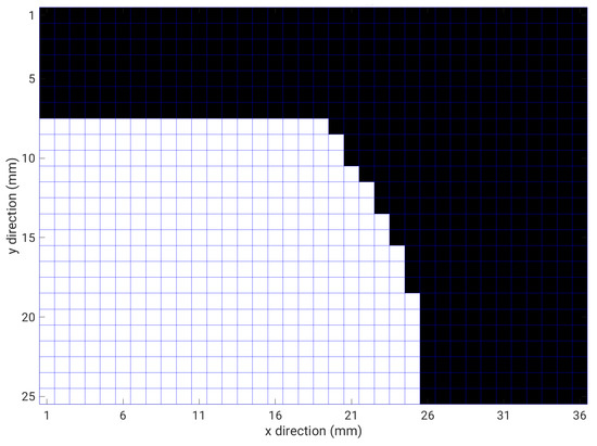 Figure 6 shows the topology of the bitmap representation, where the right mold occupation was maximized, filling all the possible pixels that do not overlap with the cavity, which represents our main geometrical constraint. In particular we represent with a black square (pixel = 1) a portion of space filled with ferromagnetic material, while a white square (pixel = 0) represents an empty portion of space. Considering