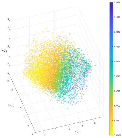 corresponding to each input image. A scatter plot of the first three principal components (PCs) can be visualized in