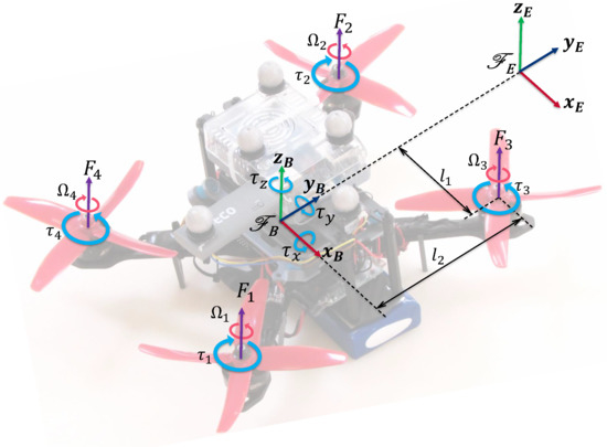 In this work, we utilize a micro-scale quadrotor robotic platform with “x-configuration” having arm lengths m and m, as displayed in Figure 1. The overall frame comprises of off-the-shelf carbon fiber arms that are assembled in-house. A Pixhawk flight controller is utilized for the low-level stabilization control, whereas an Odroid XU4 computer executes all the control codes onboard. The total takeoff mass (m) including all the onboard electronics is equal to kg.