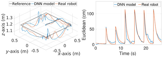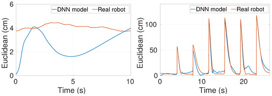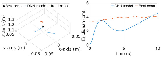 For hovering, this weight set results in a precise tracking with mean Euclidean error values of 3–4 cm over both the DNN model and real robot, as visible in Figure 3. For the sequential setpoints tracking case, it again yields a precise tracking with mean Euclidean error values of 21 cm (Figure 4). A similar performance was obtained for the DNN model and real robot for both the trajectories, further validating the high fidelity of the DNN model.
