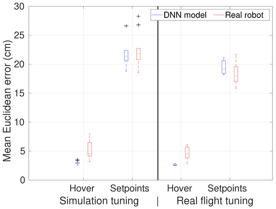 We repeat the above experiments with the ten best weight sets from simulation-based tuning to assess the overall quality. Their corresponding mean Euclidean error values are presented on the left side of Figure 5. The average and maximum error values over the DNN model are and cm for hovering. The same values over the real robot are and cm. A similar result is obtained for sequential setpoints. The respective average and maximum error values rise from and cm over the DNN model to and cm over the real robot. The slight error rise in the case of the real robot is mainly due to the operational uncertainties that are possibly not captured by the DNN model.