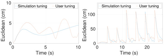 The resulting mean Euclidean errors are listed in Table 6 along with the observed number of oscillations, depicting the oscillatory behavior of a particular weight set. It is to be noted that oscillation is characterized as an abrupt change of more than 3 cm in the Euclidean error response. As can be seen, most users resulted in high Euclidean errors with moderate to high oscillations, implying an eventual crash of the robot, whereas three users obtained the real flight-worthy weight sets (marked with bold-font), which accounts for only 15% success. We would like to emphasize that most users could obtain some meaningful weight sets in a limited time as they could try abrupt values over the simulation model which otherwise might not be possible over the real robot. Essentially, the proper tuning procedure in a general case takes around 3–4 h (or even more), as noticed in our informal observations. Another point to take note in Table 6 is that for almost half of the users, the tracking performance decreased from the first to the second hour of tuning. This is counterintuitive as one expects to perform better after gaining some experience with the system. Nevertheless, utilizing the relation in (12), the proposed algorithm always looks for the weight sets which could perform better by satisfying stricter criteria.