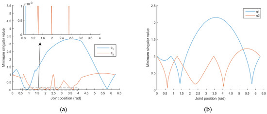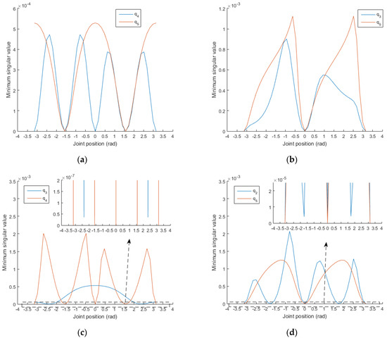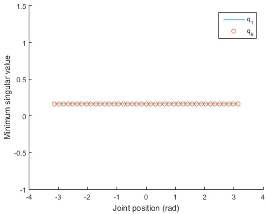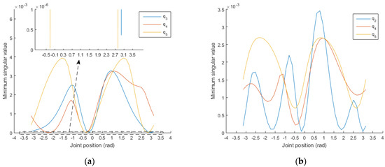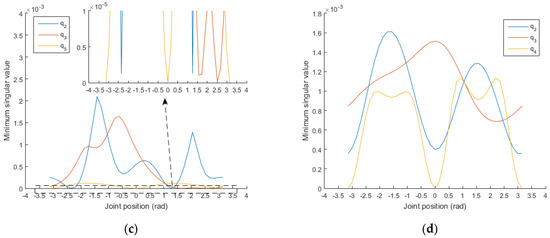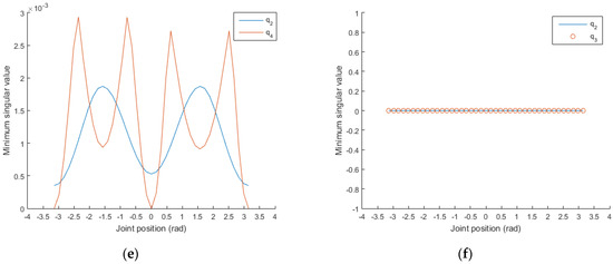 - On the basis of the set of joint positions in step 1, two joint positions are selected one by one and set to , , . From the remaining joints, a joint is selected and varied within its range, and the other joint positions remain unchanged. Finally, the distribution of the minimum singular value with the change in a joint position is obtained. For example, for a 6-DOF manipulator, , , and are set. Finally, the distribution of the minimum singular value with the change in is obtained. In the same way, the distributions of the minimum singular values with the changes in , , and are also obtained;