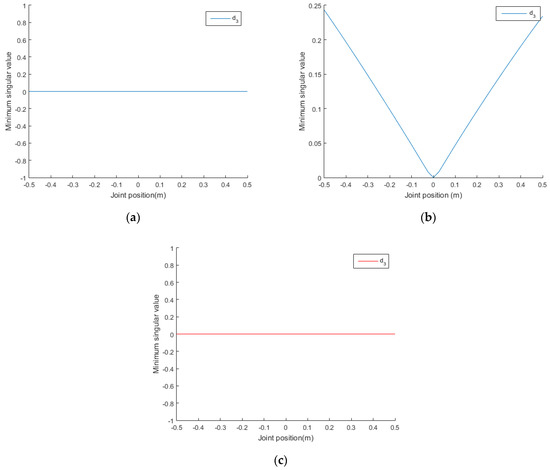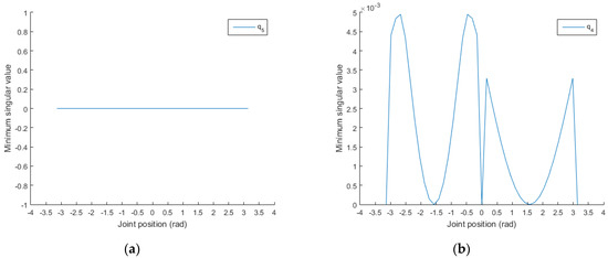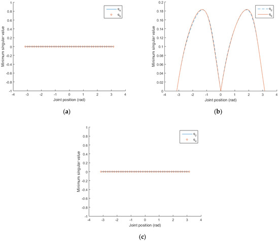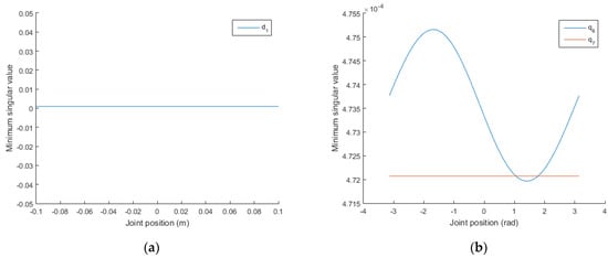 In step (2), by setting , , and by using Equation (7), ; this shows that singularity does not occur. Furthermore, by setting , , , and by using Equation (7), ; this shows that singular configurations occur (one or more joints are , ). In addition, it can be seen in Figure 2 that the minimum singular value does not change with the change in and . Therefore, and can be ignored when using the proposed method to obtain singular configurations.