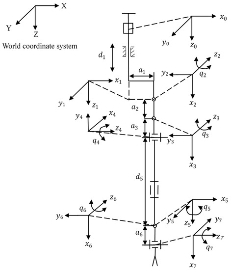 This section involves a 7-DOF serial manipulator developed by us for laparoscopic surgery that does not meet the Pieper criterion. The coordinate system is established as shown in Figure 5 and the modified DH parameters are shown in Table 2.